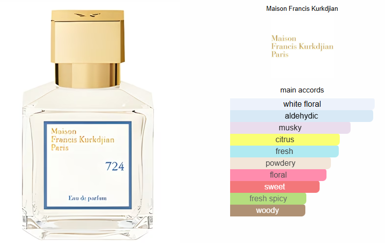 724 by Maison Francis Kurkdjian is a fragrance for women and men. This is a new fragrance. 724 was launched in 2022. The nose behind this fragrance is Francis Kurkdjian. Top notes are Aldehydes and Calabrian bergamot; middle notes are Egyptian Jasmine, Mock Orange and Sweet Pea; base notes are White Musk and Sandalwood.
