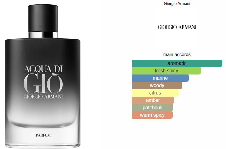 Acqua di Giò Parfum by Giorgio Armani is a Woody Aquatic fragrance for men. This is a new fragrance. Acqua di Giò Parfum was launched in 2023. The nose behind this fragrance is Alberto Morillas. Top notes are Marine notes and Bergamot; middle notes are Rosemary, Clary Sage and Geranium; base notes are Olibanum and Patchouli.