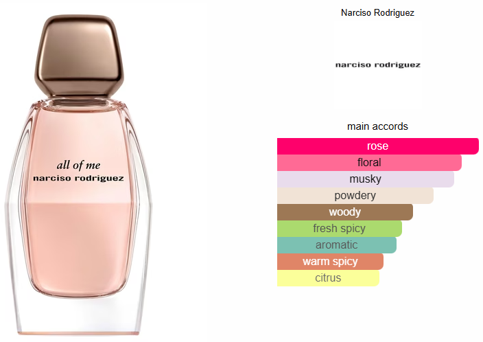 All Of Me by Narciso Rodriguez is a Floral Woody Musk fragrance for women. This is a new fragrance. All Of Me was launched in 2023. All Of Me was created by Dora Baghriche and Daphné Bugey. Top note is Magnolia; middle notes are Rose and Bourbon Geranium; base notes are Musk and Sandalwood.