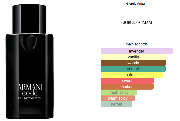 Armani Code by Giorgio Armani is a Oriental Spicy fragrance for men. Armani Code was launched in 2004. The nose behind this fragrance is Antoine Lie. Top notes are Lemon and Bergamot; middle notes are Star Anise, Olive Blossom and Guaiac Wood; base notes are Leather, Tonka Bean and Tobacco. This perfume is the winner of award FiFi Award Fragrance Of The Year Men`s Luxe 2006.