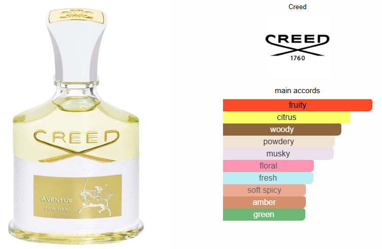 Aventus for Her by Creed is a Chypre Fruity fragrance for women. Aventus for Her was launched in 2016. Top notes are Green Apple, Bergamot, Lemon, Patchouli, Pink Pepper and Violet; middle notes are Musk, Rose, Sandalwood and Styrax; base notes are Black Currant, Peach, Amber, Lilac and Ylang-Ylang.