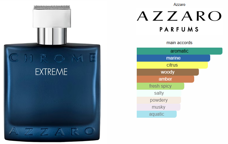 Azzaro Chrome Extreme by Azzaro is a Citrus Aromatic fragrance for men. Azzaro Chrome Extreme was launched in 2020. Top note is Green Mandarin; middle notes are Sea Notes and Juniper Berries; base notes are Cashmeran and Amber.