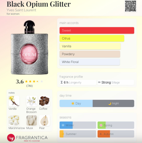 Black Opium Glitter by Yves Saint Laurent is a Oriental Floral fragrance for women. This is a new fragrance. Black Opium Glitter was launched in 2024. Top notes are Pear, Green Mandarin and Lemon; middle note is Orange Blossom; base notes are Vanilla Absolute, Coffee, Marshmallow, Musk and Patchouli.
