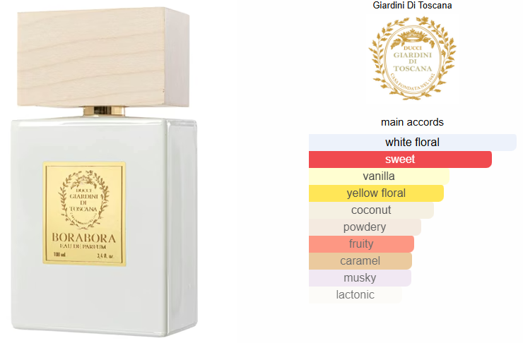 Borabora by Giardini Di Toscana is a fragrance for women and men. This is a new fragrance. Borabora was launched in 2023. The nose behind this fragrance is Silvia Martinelli. Top notes are Tiare Flower, Ylang Ylang, Jasmine and Apricot; middle notes are Coconut Milk, White Musk and Jasmolactone; base notes are Vanilla, Caramel, White Musk and Amber.