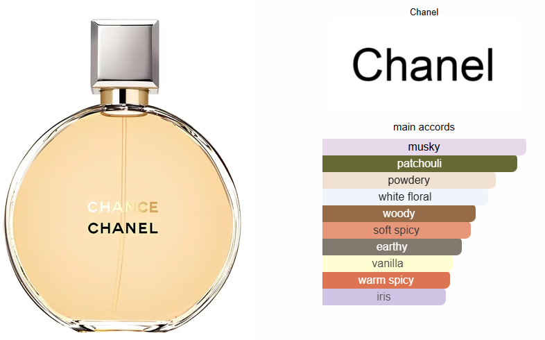 Chance Eau de Parfum by Chanel is a Chypre Floral fragrance for women. Chance Eau de Parfum was launched in 2005. The nose behind this fragrance is Jacques Polge. Top note is Pink Pepper; middle notes are Jasmine and Iris; base notes are Patchouli, Musk and Vanilla.