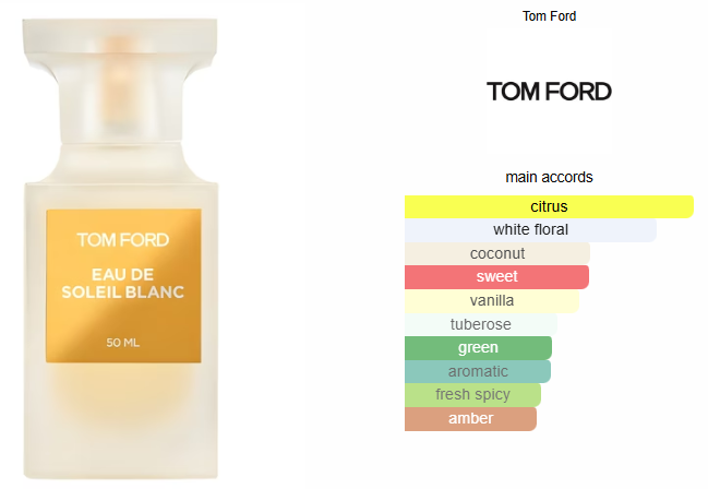 Eau de Soleil Blanc by Tom Ford is a Oriental Floral fragrance for women and men. Eau de Soleil Blanc was launched in 2018. Top notes are Bitter Orange, Neroli, Bergamot, Citron, Pistachio, Petitgrain, Cardamom, Pink Pepper and Caraway; middle notes are Tuberose, Tunisian Orange Blossom, Ylang-Ylang, Jasmine and Galbanum; base notes are Coconut, Vanilla, Tonka Bean, Amber and Benzoin.