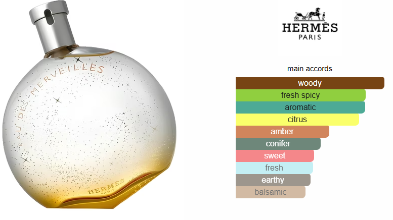 Eau des Merveilles by Hermès is a Woody fragrance for women. Eau des Merveilles was launched in 2004. Eau des Merveilles was created by Ralf Schwieger and Nathalie Feisthauer. Top notes are Orange, Elemi resin and Lemon; middle notes are Amber, Pepper, Pink Pepper and Violet; base notes are Fir, Cedar, Madagascar Vetiver, Oakmoss and Benzoin.