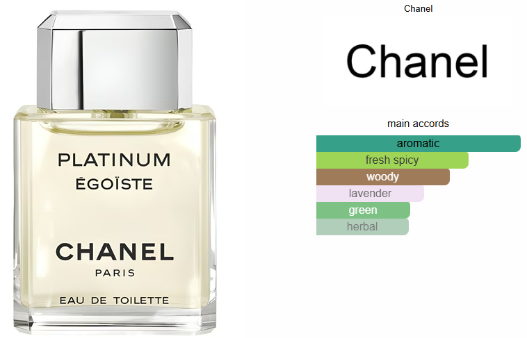Egoiste Platinum by Chanel is a Woody Floral Musk fragrance for men. Egoiste Platinum was launched in 1993. The nose behind this fragrance is Jacques Polge. Top notes are Lavender, Rosemary, Neroli and Petitgrain; middle notes are Geranium, Clary Sage, Galbanum and Jasmine; base notes are Oakmoss, Vetiver, Cedar, Sandalwood and Amber.