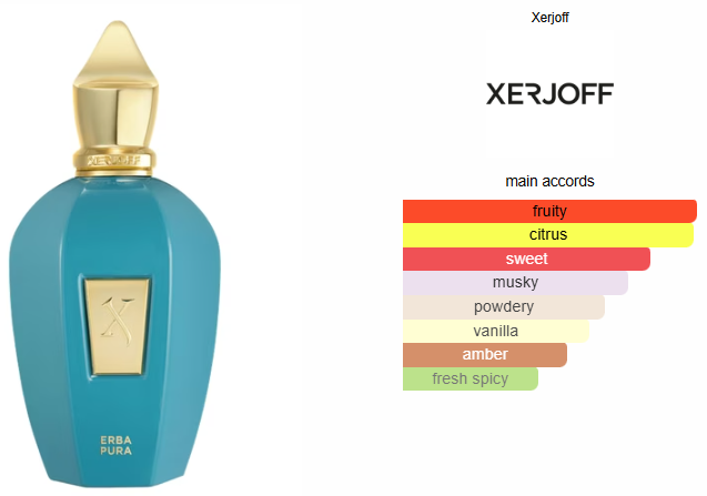 Erba Pura by Xerjoff is a Oriental fragrance for women and men. Erba Pura was launched in 2019. Erba Pura was created by Christian Carbonnel and Laura Santander. Top notes are Sicilian Orange, Calabrian bergamot and Sicilian Lemon; middle note is Fruits; base notes are White Musk, Madagascar Vanilla and Amber.