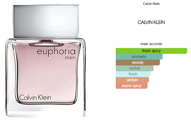 Euphoria Men by Calvin Klein is a Woody Aromatic fragrance for men. Euphoria Men was launched in 2006. Euphoria Men was created by Carlos Benaïm, Loc Dong and Jean-Marc Chaillan. Top notes are Ginger and Pepper; middle notes are Black Basil, Sage and Cedar; base notes are Amber, Suede, Brazilian Redwood and Patchouli.