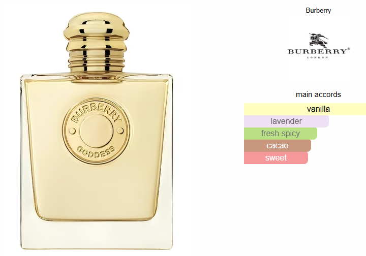 Goddess by Burberry is a Aromatic fragrance for women. This is a new fragrance. Goddess was launched in 2023. The nose behind this fragrance is Amandine Clerc-Marie. Top notes are Vanilla, Lavender, Cacao and Ginger; middle note is Vanilla Caviar; base note is Vanilla Absolute.