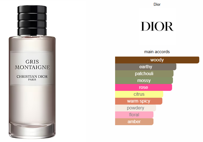 Gris Montaigne by Dior is a Chypre Floral fragrance for women. Gris Montaigne was launched in 2013. The nose behind this fragrance is François Demachy. Top notes are Bergamot and Grapefruit; middle notes are Rose, Strawberry, Jasmine, Orange Blossom and Ylang-Ylang; base notes are Patchouli, Oakmoss, Sandalwood, Amber, Cedar and White Musk.