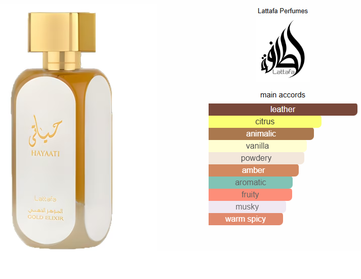 Hayaati Gold Elixir by Lattafa Perfumes is a fragrance for women and men. Top notes are Bergamot, Grapefruit and Cassis; middle notes are Leather, Peach and Saffron; base notes are Vanilla, Amber, Musk and Vetiver.