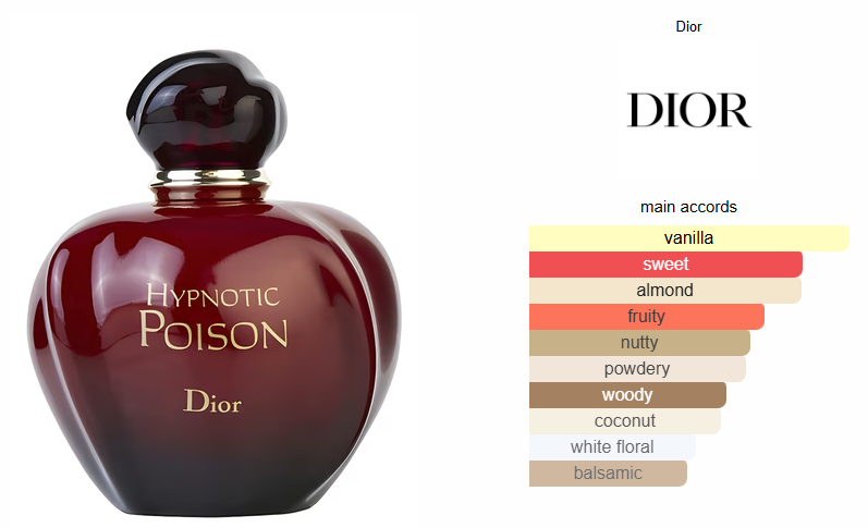 Hypnotic Poison by Dior is a Oriental Vanilla fragrance for women. Hypnotic Poison was launched in 1998. Hypnotic Poison was created by Annick Menardo and Christian Dussoulier. Top notes are Coconut, Plum and Apricot; middle notes are Brazilian Rosewood, Jasmine, Caraway, Tuberose, Rose and Lily-of-the-Valley; base notes are Vanilla, Almond, Sandalwood and Musk.