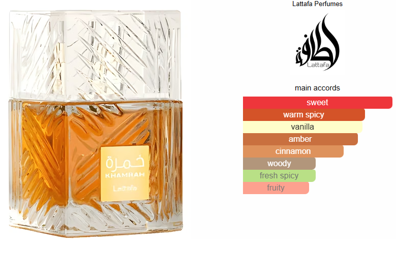 Khamrah by Lattafa Perfumes is a Oriental Spicy fragrance for women and men. This is a new fragrance. Khamrah was launched in 2022. Top notes are Cinnamon, Nutmeg and Bergamot; middle notes are Dates, Praline, Tuberose and Mahonial; base notes are Vanilla, Tonka Bean, Amberwood, Myrrh, Benzoin and Akigalawood.
