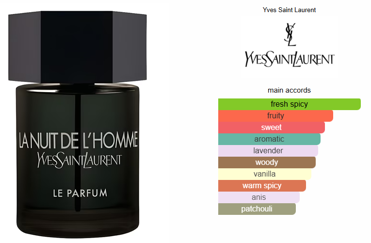 La Nuit de L'Homme Le Parfum by Yves Saint Laurent is a Oriental Fougere fragrance for men. La Nuit de L'Homme Le Parfum was launched in 2010. Top notes are Pepper, Anise and Bergamot; middle notes are Fruity Notes, Lavender and French labdanum; base notes are Vanille, Patchouli and Vetyver.