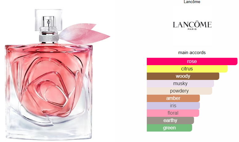 "La Vie Est Belle Rose Extraordinaire is a reinterpretation of the rose, Lancôme's iconic flower. The new floral Eau de Parfum is composed of a heart built around Iris Concrete and three different rose extracts: fresh rose water, sensual damascena absolue and space rose accord. Its floral heart is enhanced by an enveloping signature with woody musk undertones.