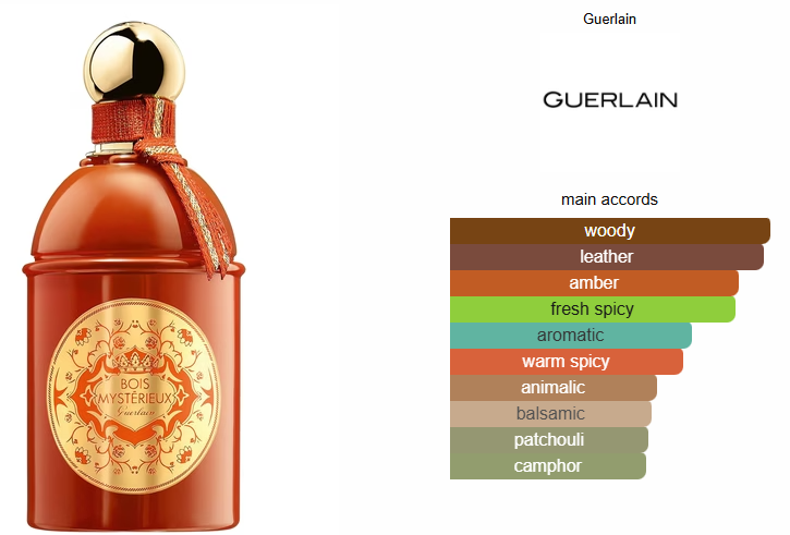 Les Absolus d'Orient Bois Mystérieux by Guerlain is a Leather fragrance for women and men. Les Absolus d'Orient Bois Mystérieux was launched in 2019. The nose behind this fragrance is Thierry Wasser. Top notes are Laurels and Neroli; middle notes are Atlas Cedar, Patchouli and Jasmine; base notes are Leather and Myrhh.