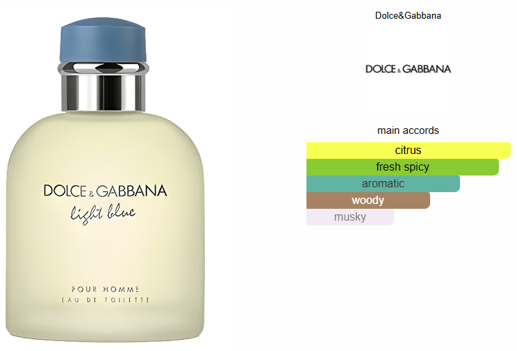 Light Blue pour Homme by Dolce&Gabbana is a Citrus Aromatic fragrance for men. Light Blue pour Homme was launched in 2007. Top notes are Grapefruit, Bergamot, Sicilian Mandarin and Juniper; middle notes are Pepper, Rosemary and Brazilian Rosewood; base notes are Musk, Incense and Oakmoss. This perfume is the winner of award FiFi Award Fragrance Of The Year Men`s Luxe 2008.