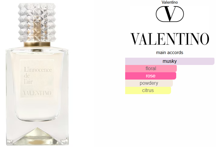 L'innocence de L'air by Valentino is a Floral fragrance for women and men. This is a new fragrance. L'innocence de L'air was launched in 2024. The nose behind this fragrance is Nathalie Lorson. Top notes are Green Mandarin and Angelica; middle notes are Ambrette, Rose and Damask Rose; base notes are Suederal® and Musk.