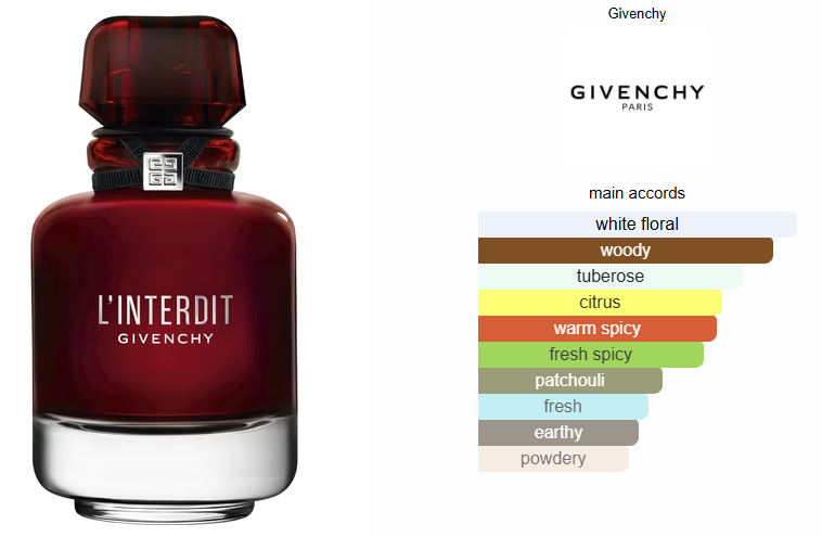 L'Interdit Eau de Parfum Rouge by Givenchy is a Oriental Floral fragrance for women. L'Interdit Eau de Parfum Rouge was launched in 2021. L'Interdit Eau de Parfum Rouge was created by Dominique Ropion, Anne Flipo and Fanny Bal. Top notes are Ginger and Blood Orange; middle notes are Tuberose, Jasmine and Pimento Leaf; base notes are Sandalwood, Patchouli and Vetiver.