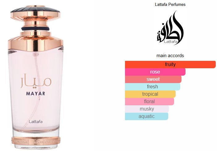 Mayar by Lattafa Perfumes is a Floral Fruity fragrance for women. This is a new fragrance. Mayar was launched in 2022. Top notes are Litchi, Raspberry and Violet Leaf; middle notes are White Rose, Peony and Jasmine; base notes are Musk and Vanilla.