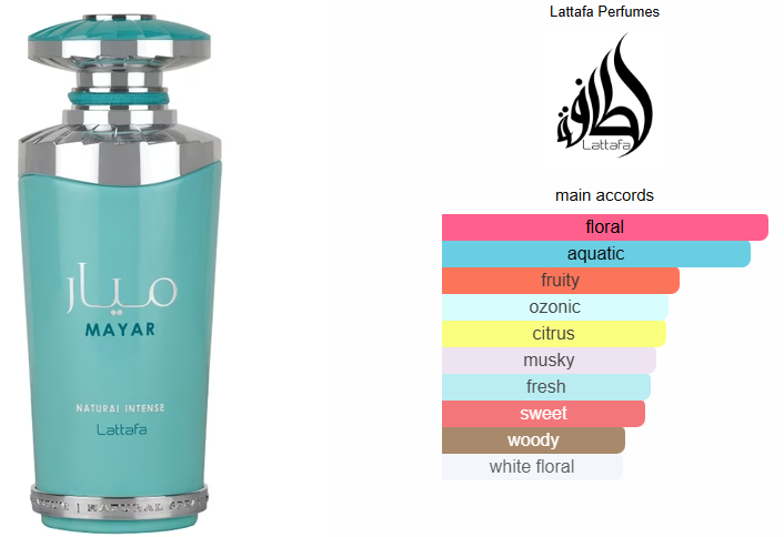 Mayar Natural Intense by Lattafa Perfumes is a fragrance for women. This is a new fragrance. Mayar Natural Intense was launched in 2024. Top notes are Green Tangerine, Fig, Melon and Coconut Water; middle notes are Water Lily, Lotus and Jasmine; base notes are Musk, Ambroxan, Vanilla and Sandalwood.
