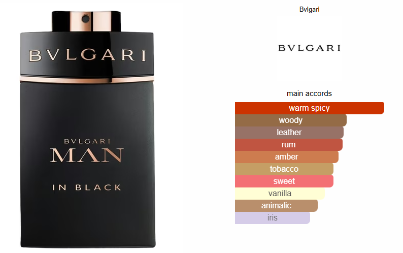 Bvlgari Man In Black is an intense composition of amber, leather, spices and woods. It opens with accords of natural rum and luminous spices. Tuberose, iris absolut and leather form the core of the perfume, placed on the base of benzoin, tonka bean and guaiac wood.