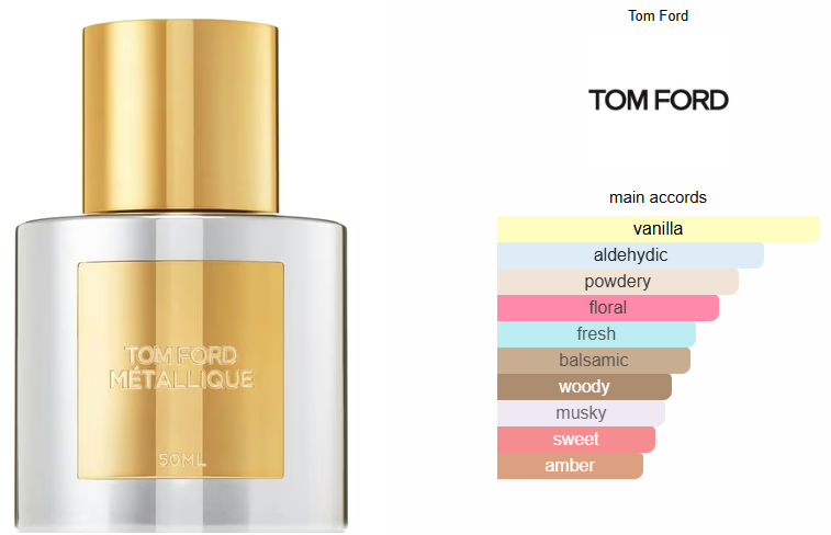 Metallique by Tom Ford is a Floral Aldehyde fragrance for women. Metallique was launched in 2019. Top notes are Aldehydes, Pink Pepper and Bergamot; middle notes are Heliotrope, Hawthorn and Lily-of-the-Valley; base notes are Vanilla, Ambrette (Musk Mallow), Peru Balsam and Sandalwood.