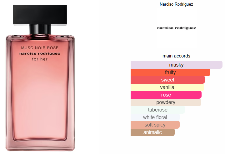 Musc Noir Rose For Her by Narciso Rodriguez is a Oriental Floral fragrance for women. This is a new fragrance. Musc Noir Rose For Her was launched in 2022. The nose behind this fragrance is Sonia Constant. Top notes are Plum, Pink Pepper and Bergamot; middle notes are Musk, Rose and Tuberose; base note is Vanilla.