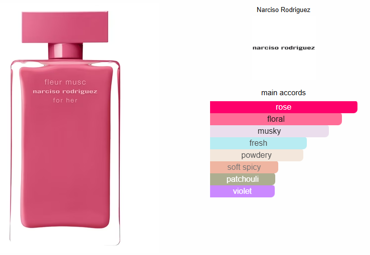 Narciso Rodriguez Fleur Musc for Her by Narciso Rodriguez is a Floral Woody Musk fragrance for women. Narciso Rodriguez Fleur Musc for Her was launched in 2017. Narciso Rodriguez Fleur Musc for Her was created by Calice Becker and Sonia Constant. Top note is Pink Pepper; middle notes are Rose, Musk and Peony; base notes are Patchouli, Violet and Amber.