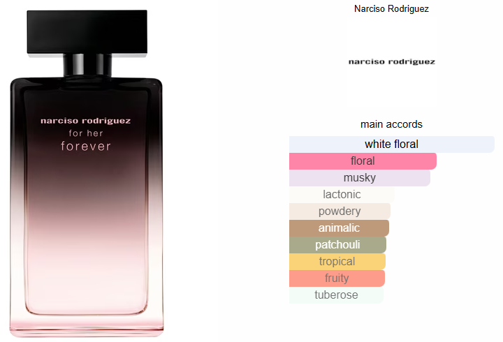Narciso Rodriguez For Her Forever by Narciso Rodriguez is a Floral Woody Musk fragrance for women. This is a new fragrance. Narciso Rodriguez For Her Forever was launched in 2023. The nose behind this fragrance is Sonia Constant. Top notes are Jasmine, Frangipani and Gardenia; middle notes are Osmanthus, African Orange Flower and Tuberose; base notes are Musk and Patchouli.