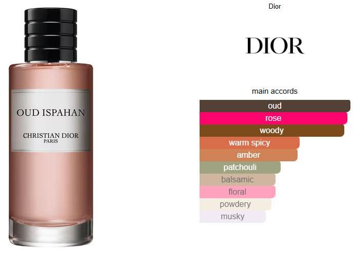 Oud Ispahan by Dior is a Oriental Floral fragrance for women and men. Oud Ispahan was launched in 2012. The nose behind this fragrance is François Demachy. Top note is Labdanum; middle notes are Rose, Patchouli and Saffron; base notes are Agarwood (Oud), Sandalwood and Cedar.