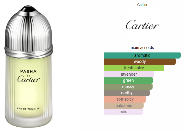 Pasha Cartier by Cartier is a Woody Aromatic fragrance for men. Pasha Cartier was launched in 1992. The nose behind this fragrance is Jacques Cavallier Belletrud. Top notes are Lavender, Mint, Caraway, Anise and Mandarin Orange; middle notes are Coriander and Brazilian Rosewood; base notes are Oakmoss, Sandalwood, Patchouli and Labdanum.