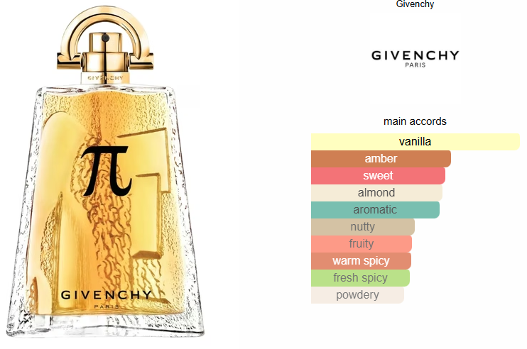 Pi by Givenchy is a Oriental Woody fragrance for men. Pi was launched in 1998. The nose behind this fragrance is Alberto Morillas. Top notes are Mandarin Orange, Tarragon, Rosemary and Basil; middle notes are Anise, Neroli, Geranium and Lily-of-the-Valley; base notes are Vanilla, Almond, Tonka Bean, Benzoin and Cedar.