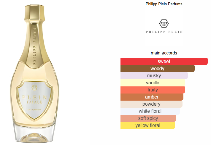 Plein Fatale by Philipp Plein Parfums is a Floral Fruity Gourmand fragrance for women. This is a new fragrance. Plein Fatale was launched in 2022. The nose behind this fragrance is Alberto Morillas. Top notes are Black Currant, Bergamot, Ambroxan and Pink Pepper; middle notes are Ylang-Ylang, Tuberose, Jasmine and Rose Petals; base notes are Vanilla, Praline, Musk, Patchouli, Amber and Sandalwood.