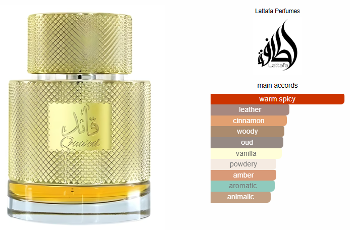 Qaa'ed by Lattafa Perfumes is a Oriental fragrance for women and men. Qaa'ed was launched in 2018. Top notes are Cinnamon, Cardamom and Bergamot; middle notes are Saffron, Sandalwood, Cedar and Carnation; base notes are Agarwood (Oud), Vanilla, Leather and Amber.