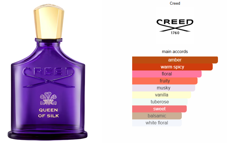 Queen of Silk by Creed is a Oriental Floral fragrance for women. This is a new fragrance. Queen of Silk was launched in 2024. Top notes are Saffron, Osmanthus and Magnolia; middle notes are Passionfruit, Tuberose, Patchouli and Agarwood (Oud); base notes are Ambroxan, Madagascar Vanilla, Myrrh, Musk, Cedarwood and Incense.