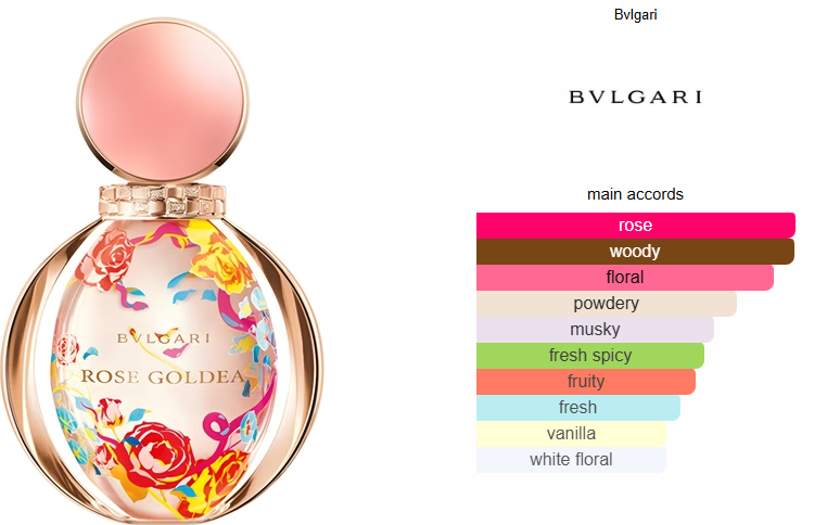 Rose Goldea Jacky Tsai Edition by Bvlgari is a Floral Woody Musk fragrance for women. Rose Goldea Jacky Tsai Edition was launched in 2018. The nose behind this fragrance is Alberto Morillas. Top notes are Rose, Pomegranate, Musk and Bergamot; middle notes are Damask Rose, Peony, Jasmine and Peach; base notes are Musk, Vanilla, Sandalwood and Olibanum.