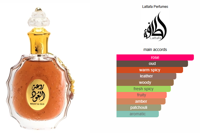 Rouat Al Oud by Lattafa Perfumes is a Woody Spicy fragrance for women and men. Rouat Al Oud was launched in 2020. Top notes are Saffron and Raspberry; middle notes are Rose, Geranium and Patchouli; base notes are Agarwood (Oud), Amber, Leather and Cedar.