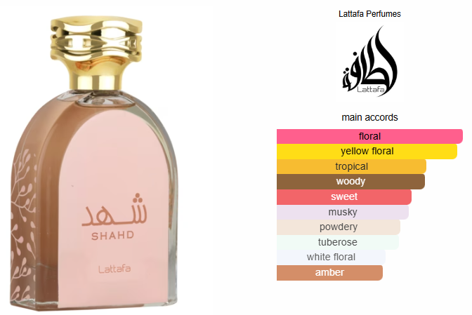 Shahd by Lattafa Perfumes is a Floral Woody Musk fragrance for women. This is a new fragrance. Shahd was launched in 2023. Top notes are Ylang-Ylang and Frangipani; middle notes are Solar Notes and Tuberose; base notes are Musk, Amber, Vanilla and Cedar.