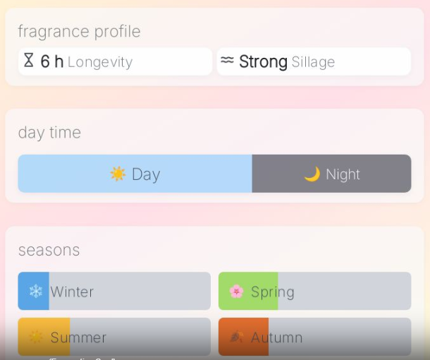The fragrance is described as an intense floral ambery fruity. It includes notes of mandarin, Williams pear, pink pepper, tuberose, frangipani, ylang-ylang, tonka bean and cedar wood.