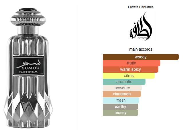 Sumou Platinum by Lattafa Perfumes is a fragrance for women and men. This is a new fragrance. Sumou Platinum was launched in 2022. Top notes are Apple, Bergamot, Plum, Oakmoss and Lemon; middle notes are Cinnamon, Clove and Mahogany; base notes are Sandalwood, Cedar, Vanilla and Vetiver.