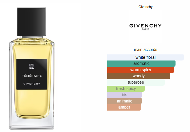 Téméraire by Givenchy is a Oriental Floral fragrance for women and men. This is a new fragrance. Téméraire was launched in 2023. The nose behind this fragrance is Nicolas Bonneville. Top notes are Clove Leaf and Cardamom; middle notes are Tuberose, Jasmine and Iris; base notes are Ink, Cade oil and Benzoin.
