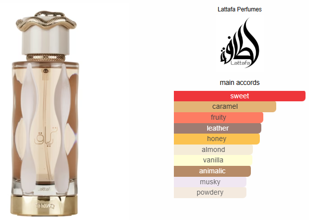 Teriaq by Lattafa Perfumes is a fragrance for women and men. This is a new fragrance. Teriaq was launched in 2024. The nose behind this fragrance is Quentin Bisch. Top notes are Caramel, Bitter Almond, Apricot and Pink Pepper; middle notes are Honey, Rhubarb, White Flowers and Rose; base notes are Leather, Vanilla, Musk, Labdanum and Vetiver.
