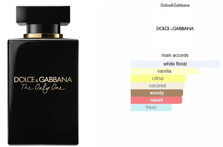 The Only One Eau de Parfum Intense by Dolce&Gabbana is a Oriental Floral fragrance for women. The Only One Eau de Parfum Intense was launched in 2020. The nose behind this fragrance is Violaine Collas. Top notes are Neroli, Green Apple and Italian Mandarin; middle notes are Jasmine, Coconut and Orange Blossom; base notes are Vanilla, Cashmere Wood and Cedar.