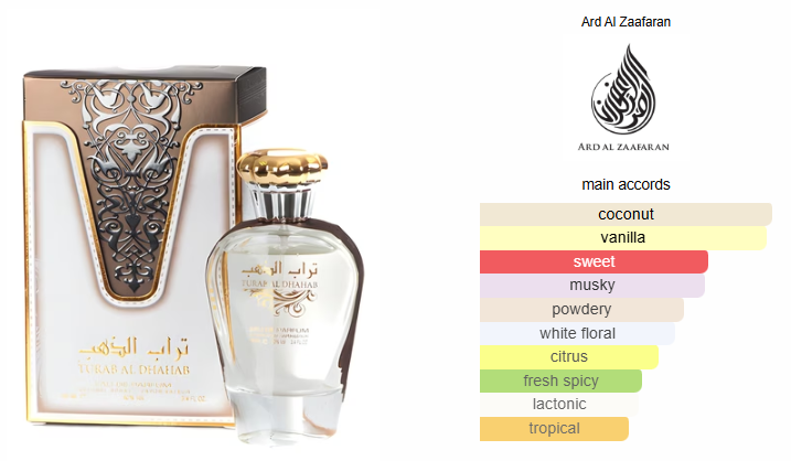 Turab Al Dhahab by Ard Al Zaafaran is a Floral Fruity Gourmand fragrance for women. Top notes are White Flowers and Lime; middle notes are Coconut Milk, Vanilla and Nutmeg; base note is Musk.