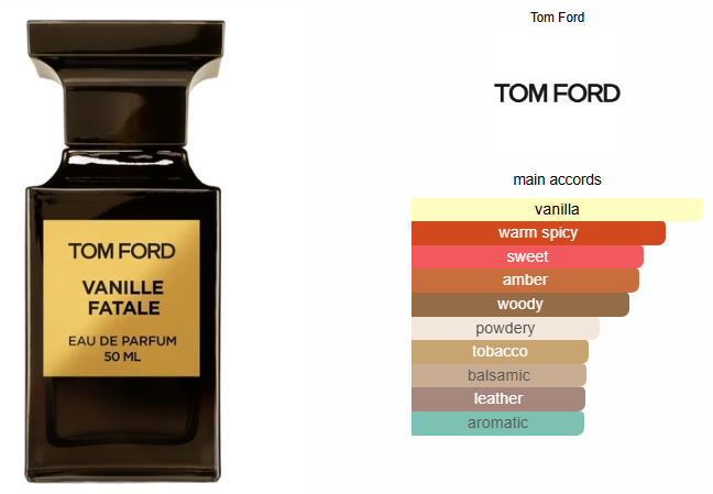 Vanille Fatale by Tom Ford is a Oriental Vanilla fragrance for women and men. Vanille Fatale was launched in 2017. The nose behind this fragrance is Yann Vasnier. Top notes are Rum, Myrrh, Olibanum, Saffron, Coriander, Orange and Lime; middle notes are Barley, Coffee, Plum, Frangipani, Narcissus, Artemisia and Rose; base notes are Madagascar Vanilla, Suede, Tobacco, Mahogany, Patchouli, Oakmoss and Violet.