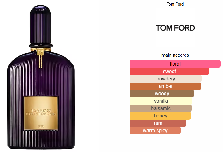 Velvet Orchid by Tom Ford is a Oriental Floral fragrance for women. Velvet Orchid was launched in 2014. Velvet Orchid was created by Yann Vasnier, Calice Becker, Shyamala Maisondieu and Antoine Maisondieu. Top notes are Rum, Honey, Mandarin Orange and Bergamot; middle notes are Black Orchid, Orchid, Jasmine, Heliotrope, Hyacinth, Rose Oil, Narcissus, Magnolia and Orange Blossom; base notes are Vanilla, Myrrh, Suede, Sandalwood, Peru Balsam and Labdanum.