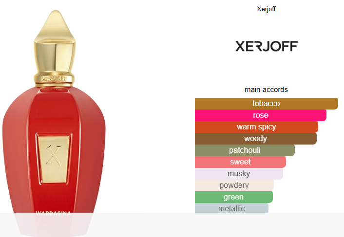 Wardasina by Xerjoff is a Oriental Floral fragrance for women and men. Wardasina was launched in 2019. The nose behind this fragrance is Chris Maurice. Top note is Green Notes; middle notes are Bulgarian Rose, Saffron, Patchouli and Cedar; base notes are Tobacco, Musk and Vanilla.